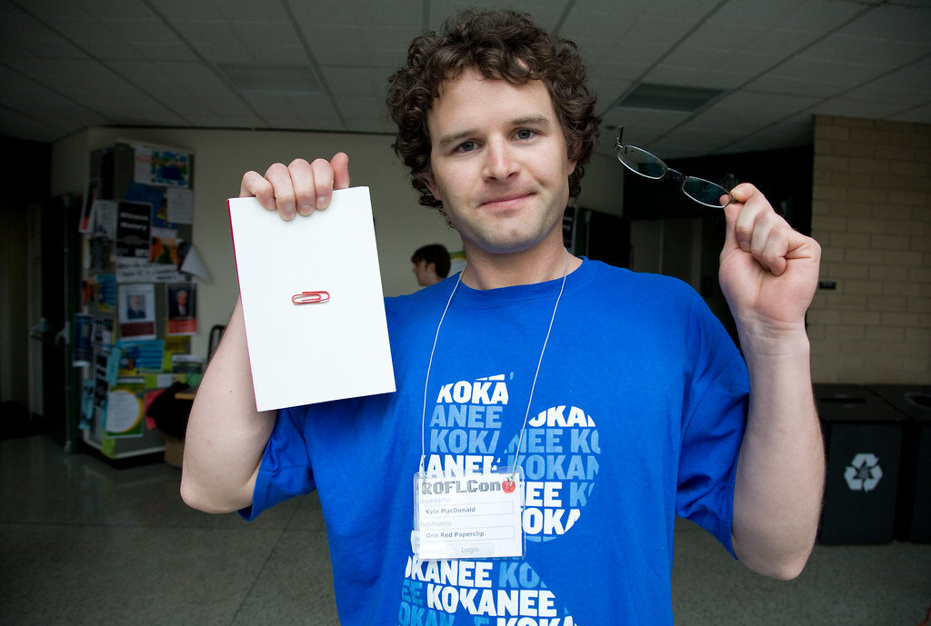В июле 2005-го года Кайл разместил на сайте фото той самой красной скрепки,подписав:»Обменяю скрепку на любой предмет.Продолжу обмен,пока не обменяюсь на дом».В этот же день он обменял скрепку на шариковую ручку в форме рыбки