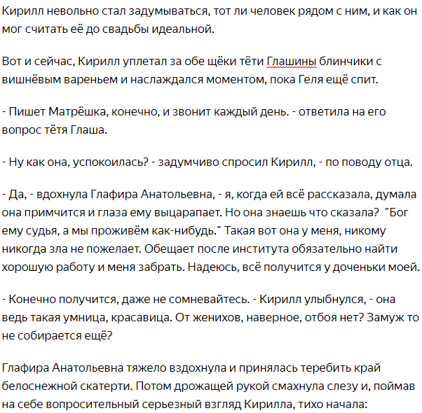 — Как там матрёшка наша поживает, пишет? — спросил Кирилл и улыбнулся. Матрёшкой он называл дочку тёти Глаши, Машеньку. Почему, он даже сам не знал, но очень ему нравилась её так называть. Они с самого детства росли вместе. Когда-то по соседству жили родители Кирилла и Маши, и ребятишки много времени проводили друг с другом, то во дворе то в гостях одного из них.