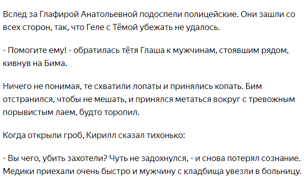 А незадолго до этого дело было так. Вернувшись из Москвы, Глафира Анатольевна не могла понять что происходит в доме. Кирилл научил её на всякий случай просматривать записи с камер видеонаблюдения. Увидав на мониторе пылкую встречу супруги Кирилла со своим названным братом, и услышав их разговор, она чуть сознание не потеряла, и сразу сообщила в полицию. А потом услышала, как Бим скулит в подвале.